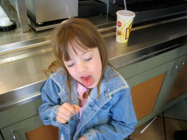 [She yawns, but I catch her so she quickly turns it into a funky facial contortion, as she is adamant about not being sleepy.]